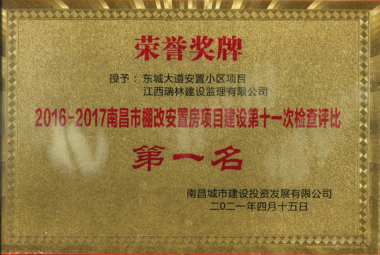 中国瑞林南昌东城大道项目监理部荣获南昌城投房地产开发有限公司第十一次检查评比第一名